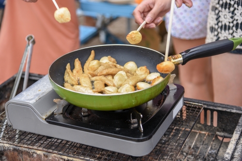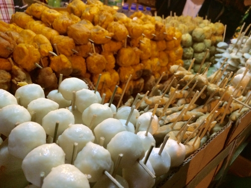 日本でいう「かまぼこ」。魚、タコ、イカ、野菜など、いろんな味が選べます。好きなものを選んで、店のおばちゃんおじちゃんに渡せば、その場でカラリと揚げてくれます。