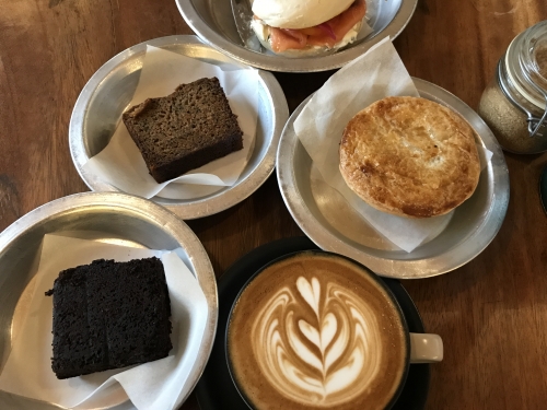 写真:トラベルライターBananaケーキ(約120円)、Steak and Mushroomパイ(約350円)、ハートが描かれているのはFLAT WHITE(約350円)