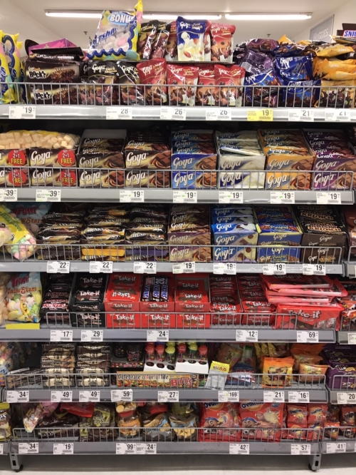 どこのスーパーもお菓子売り場が広い!