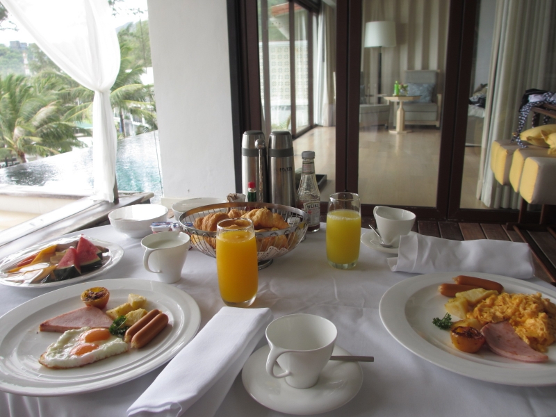 たくさんのフルーツやパン、ベーコンエッグやソーセージ、ホットチョコレートやコーヒー、マンゴージュース等自分たちが食べたい、飲みたい物を海を見ながら自分たちだけでゆっくり朝食をとることができます。
