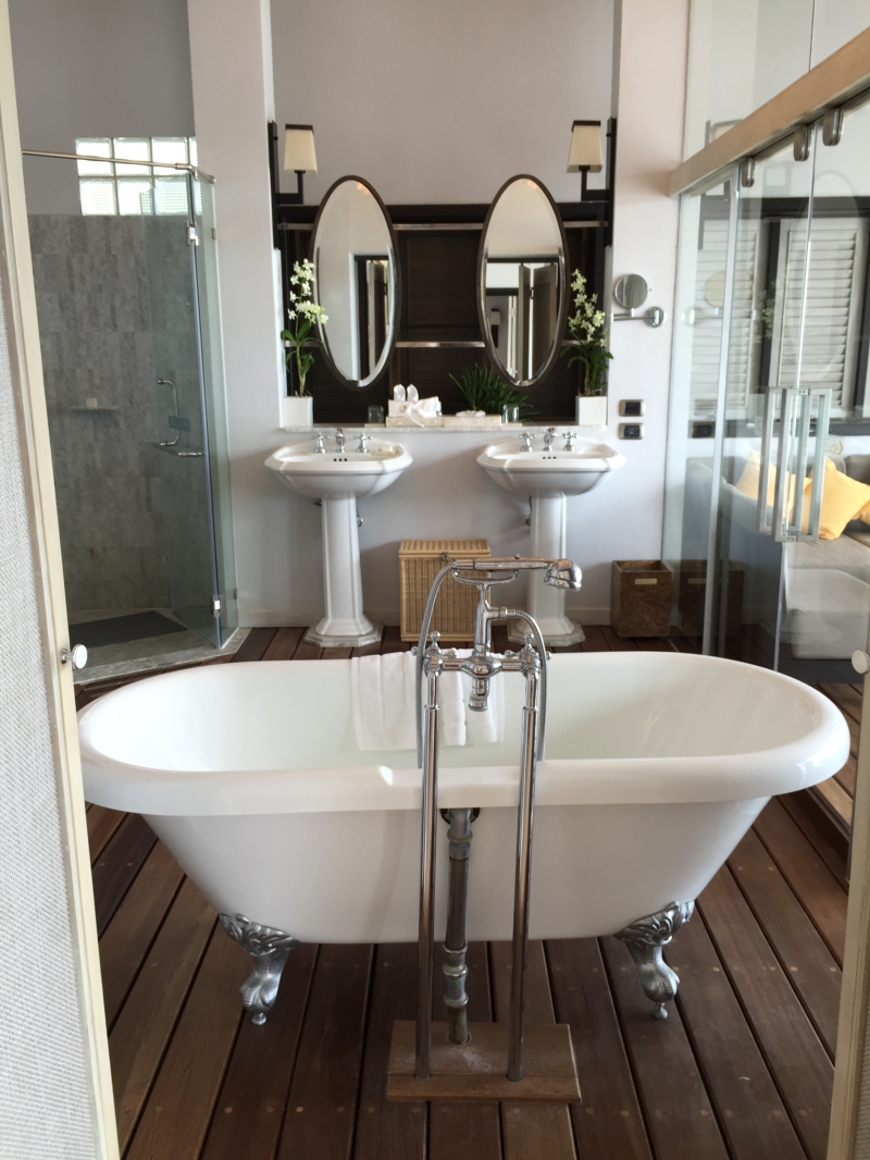 またキングサイズのベッドに加え、外の海を窓越しに眺めながら入れるバスタブ、シャワールーム、洗面所があります。プールで泳いだ後は、水着をぬいですぐシャワーを浴びることができます。