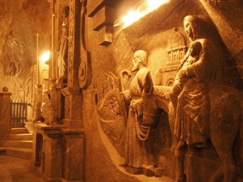 とても広く、ダンスホールのような広い場所。実は岩塩鉱で働いていた人々の安全を守るための礼拝所です。驚くべきは、壁はもちろん、床、シャンデリア、祭壇、レリーフに至るまで塩でできていることです。