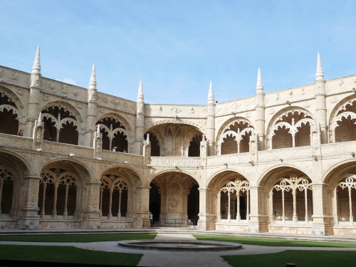 世界遺産でもあるジェロニモス修道院は、リスボンを代表する観光スポットであり、建築の美しさが特徴です。中央に芝生の中庭があり、その周りを回廊が囲んでいます。壁や柱の彫刻は、圧倒されてしまう美しさです!チケットは10ユーロ(約1,260円)です。