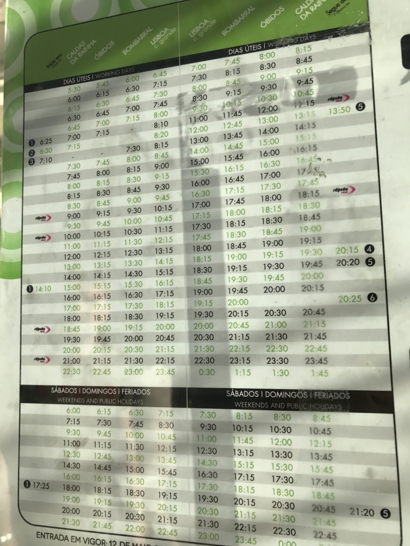 バスは30分〜1時間に一本の割合で出ていて(週末や休日は本数が減ります)、最新の時刻はテージョ社のHPから確認できるので安心です。出発地と行先を入れられるので「LISBOA(CAMPO GRANDE)」「OBIDOS」を入れて検索してくださいね。