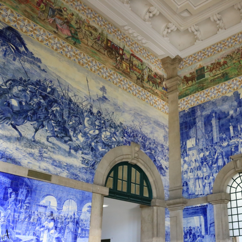 駅の構内は、アズレージョ(ポルトガルのタイル)で装飾されています。青と白のアズレージョで描かれているのは、ポルトガルの歴史的出来事とのこと。駅に用事がなくても訪れたい場所です。