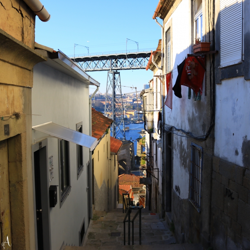 民家の間からはドン・ルイス1世橋が見え、階段を下りきると橋の麓にたどり着きます。ローカルな風景と迫力あるドン・ルイス1世橋を写真におさめましょう。