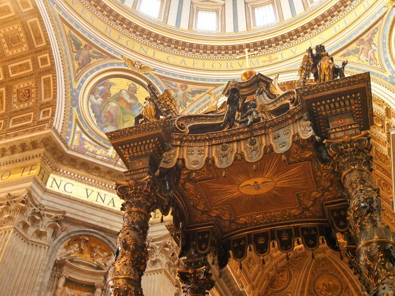 もう一つは、クーポラの真下にある大天蓋(バルダッキーノ)。教皇の祭壇を覆うブロンズ製の大天蓋で、こちらもベルニーニが手掛けた高さ29mもの大作です。