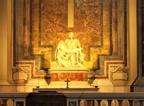 入り口の扉は5つ。左から「死の扉」、「善と悪の扉」、「中央扉」、「秘蹟の扉」、「聖年の扉」とあり、「聖年の扉」は、25年に1度しか開かない扉で、次に開くのは2025年の予定です。大聖堂での必見はミケランジェロ作のピエタ像。死んだキリストを抱く、悲哀に満ちた聖母マリアの彫刻に胸を打たれます。