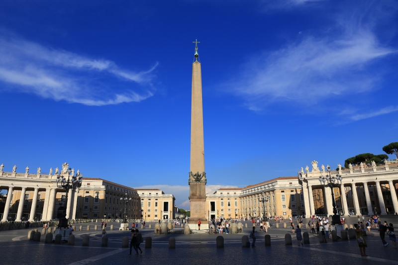 サン・ピエトロ大聖堂の前に広がる楕円形の広場で、先ほどから何度も紹介しているローマを代表する芸術家(彫刻家・建築家・画家の肩書を持つ)ベルニーニが設計しています。広場の大きさは、長さ340m、幅は240m、最大30万人を収容できる敷地です。中央にそびえるオベリスクは、ローマ皇帝がエジプトから持ち帰ったもので、高さ25.31mにもなります。