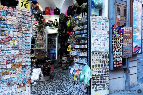 ローマ市内を観光していると、よく見かける土産店。ミネラルウォーターや軽食を買うのにも便利なお店ですが、ちょっとしたお土産を買うのにも便利です。Tシャツやキーホルダー、マグネットやおもちゃ、マグカップやポーチなど、バラマキ土産にも良さそうな、多数の雑貨を扱っています。