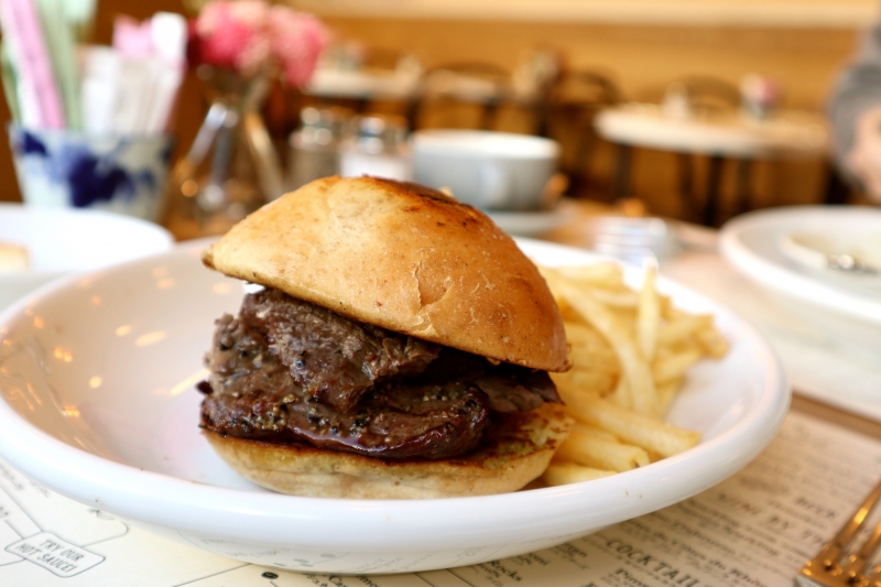 ガーリックバターが塗られて焼かれた香ばしいロールパンの間に、赤ワインに漬け込んだハラミステーキ(150g)がたっぷり挟まった「プレゴロール」は食べ応えのある逸品。ナイフで半分にするのは困難なので、手で持って大胆にガブっとかぶり付いて食べましょう。サイドにフレンチフライか、ルッコラのサラダを選べます。