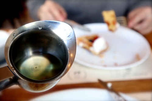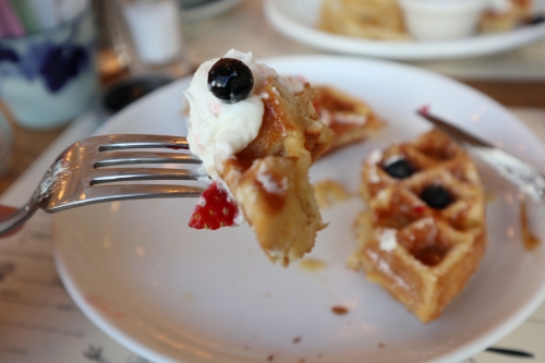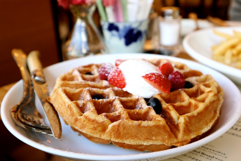 ミックスベリーやギリシャヨーグルトが添えられ、ハニーシロップををかけていただく、「ローズウォーターワッフル」も人気のスイーツメニューです。ワッフル自体はもっちりした食感で、ローズウォーターが入った生地なので、ほのかに薔薇の香りがします。