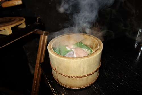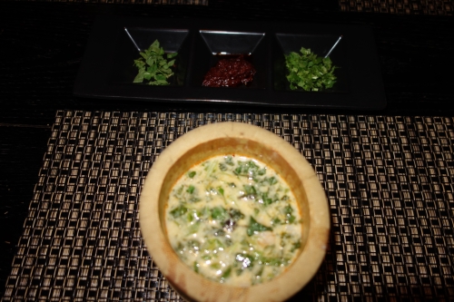 六品目は、名物灼熱投石鍋。桶には300度に熱した石が置かれ、まずは豚肉、ほうれん草、小松菜、春菊を入れ、最後にトムヤムクン・スープを注ぎます。熱々の湯気とジュージュー豚肉の焼ける音にびっくり!目の前でくノ一が作ってくれる嬉しいサービス。ミント、トムヤムクンペイスト、パクチーの三種類の薬味が付いているので、お好みで入れてみましょう。