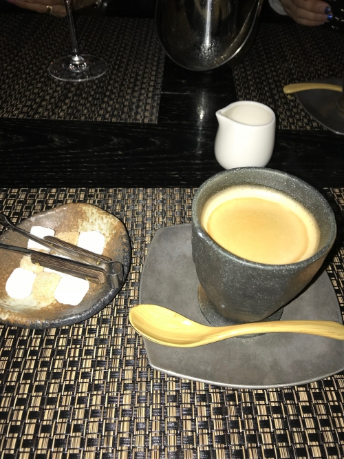 七品目は、忍びの衆(シュー)。真っ黒に焼かれたシュークリームは、ちょっとグロテスク。黒く焼かれたシューの皮の中には、サーモンと豆腐のタルタルが入っていて、ほんのり甘みのある皮との相性抜群。