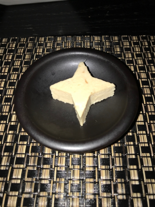 拾一品目は、本日のデザート。雪カエルと呼ばれる、可愛いカエルのチーズケーキ。チーズケーキの中はストロベリー、キウイ、ブルベリーなどのフルーツが入っている、ちょっぴり甘酸っぱいデザート。