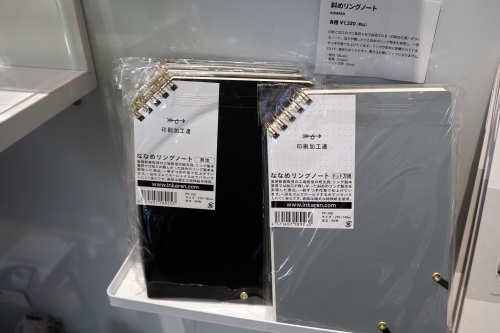 ステーショナリー関連では、今まで見たことがないような左斜め上がリング製本されている「ななめリングノート」がおすすめ。一冊ずつ手作業で仕上げられていて、右下一辺をゴムでホールドすることで、ページがバラバラしにくく、表紙には特殊紙を使用しているので頑丈です。