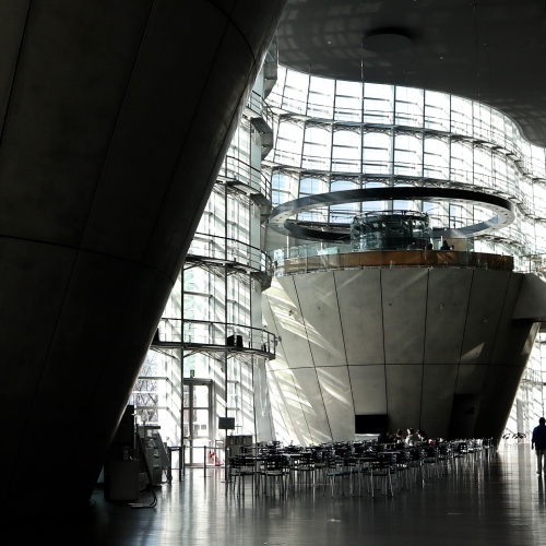 国立新美術館はガラス張りの外観がユニークですが、館内には2つの円錐の上にレストランやカフェもあります。特に、2Fのカフェ「サロン・ド・テ ロンド」は、映画『君の名は。』の中で、主人公の瀧くんがバイト先の先輩とデートでランチをしていた聖地として知られていますので、ミュージアムショップでショッピングを楽しんだ後の休憩場所にぜひ!