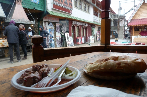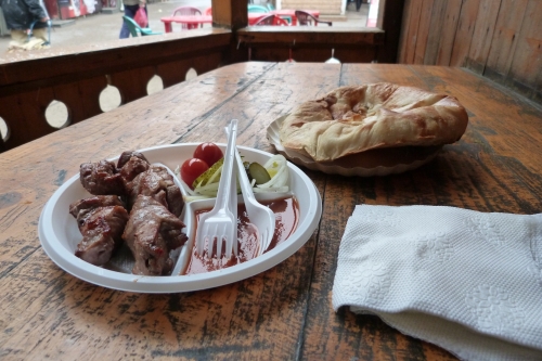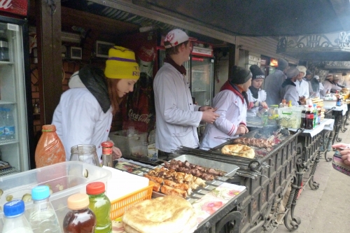 イズマイロフスキー市場の入口付近には、ロシア名物であるピロシキをはじめ、シャシリクと呼ばれる肉の串焼きなどを味わえるお店が数店舗あります。屋台スタイルでありながら、近くにはテーブルやチェアが用意されているため、食べ歩きはもちろん座ってゆったりと食事をすることも可能です。