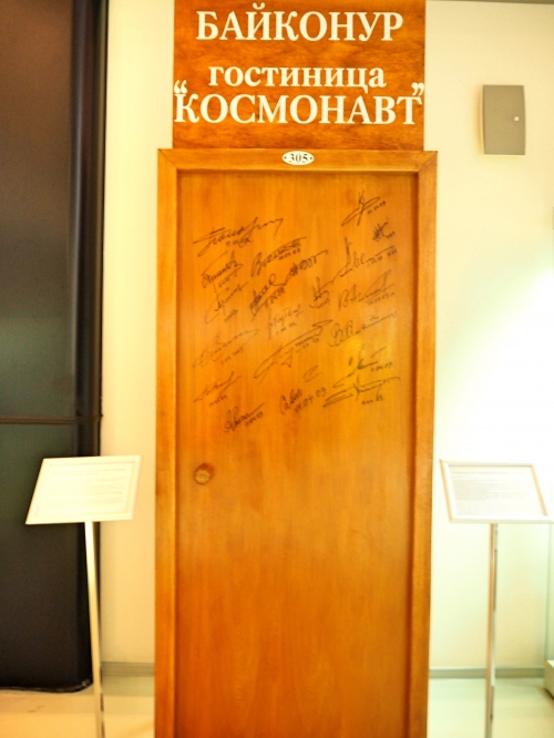 写真:Emily宇宙飛行士たちの出発の地、「バイコヌール」にあるホテルのドア。宇宙飛行士は「儀式」としてこのホテルのドアにサインをしてから出発するそうです。よく見ると、日本人宇宙飛行士のサインも。