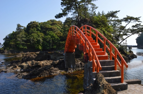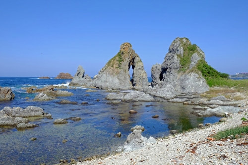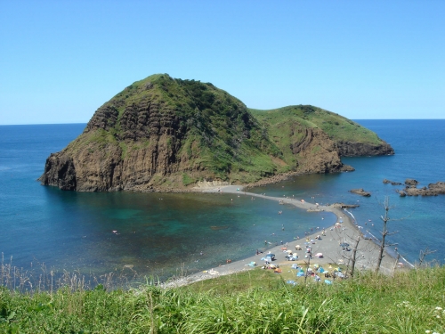 大きな巨岩が二つ並んでいる、島の北部にある景勝地です。周囲の海は青く澄んでおり、日本の海水浴場100選にも選ばれている場所で、夏休みには多くの海水浴を楽しむ人々でにぎわいます。また、干潮時には砂浜が広がり島から歩いて渡る事もできます。