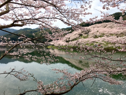嬉野温泉の北西、長崎県境に近いところにあるダムで、周囲約2kmに渡ってぐるっと植えられている木が全て桜。ダムの周回路のどこから見ても対岸の美しい景色が見られます。