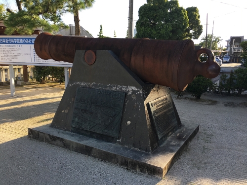 佐賀城跡の北側に位置し、入口には大砲が置かれています。これは、ペリー来航に慄いた幕府が佐賀藩に製造を依頼した、日本初の鉄製のカノン砲を復元したもの。佐嘉神社では毎年大晦日に年明けを祝って、このカノン砲を打つそうです。