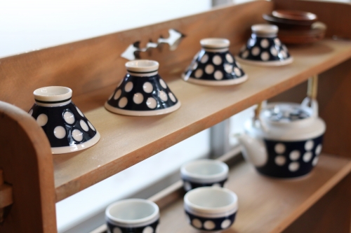 吉田焼お馴染みのデザインといえば、昔から変わらない紺地に水玉模様のレトロな急須と湯のみ。こちらが、代表的な吉田焼のデザインです。その他、最近の若手作家が作り出すシンプルで普段使いにもぴったりなモダンな吉田焼きも、近年人気を博しています。