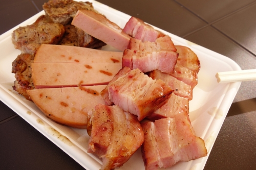 お土産、地域物産などを扱うMarket hall/マーケットホール1階では、埼玉県を代表する食品加工のサイボク名物、「ゴールデンポーク」が熱々でいただけます。もりもりセット(¥1,100)をオーダーすれば、ハムやベーコンの食べ比べもできますよ。