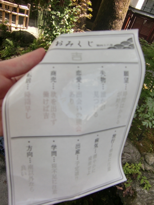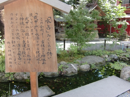 また秩父神社には、「水占い」といわれる一風変わったおみくじがあります。おみくじ売場の前には小川があり、秩父が誇る武甲山を水源とする伏流水が流れています。そこにおみくじを浸すと・・・このように文字が浮かび上がってきます。秩父神社のご祭神は武甲山に鎮座しているとされ、その武甲山の水につけることで更なる御利益があるという、縁起の良いおみくじです。