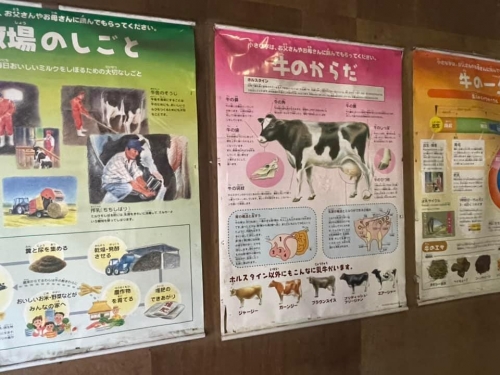 その他にも牛舎内では、「牛のからだ」や「牛の一生」、「牛乳ができるまで」や「牧場のしごと」について判りやすく紹介されていて、大人も子供も楽しみながら学べます。