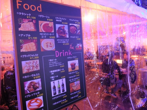 温かいワインや北欧風のスープ、ドイツ風シチューやソーセージなどの軽食に、デザートまで豊富なメニュー。ベルリン名物のカリーヴルスト(¥600)など、ここだけでしか食べられないメニューもそろっています。