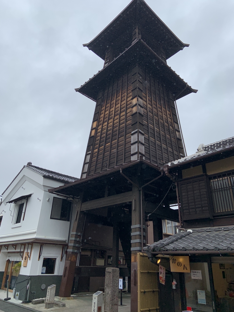 続いて、鐘つき通りを散策しましょう。こちらは、蔵造りの町並みの大きな通りから東に延びています。石畳の道や大きな鐘楼「時の鐘(ときのかね)」があり、風情のある町並みが見られます。