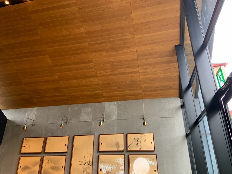 内装にもさまざまな工夫が見られます。カウンターには江戸黒漆喰を使用し、客席のベンチには、伝統的な織物の川越唐桟(かわごえとうざん)で装飾されています。さらに、奥の壁には襖絵を切り取ったものを額に入れて飾るというこだわりようです。
