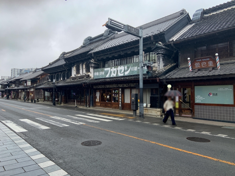 まずは、川越観光のメインエリアともいえる「蔵造りの町並み」を散策しましょう。こちらには、広い道路に沿って、蔵造りの重厚な町家が立ち並んでいます。