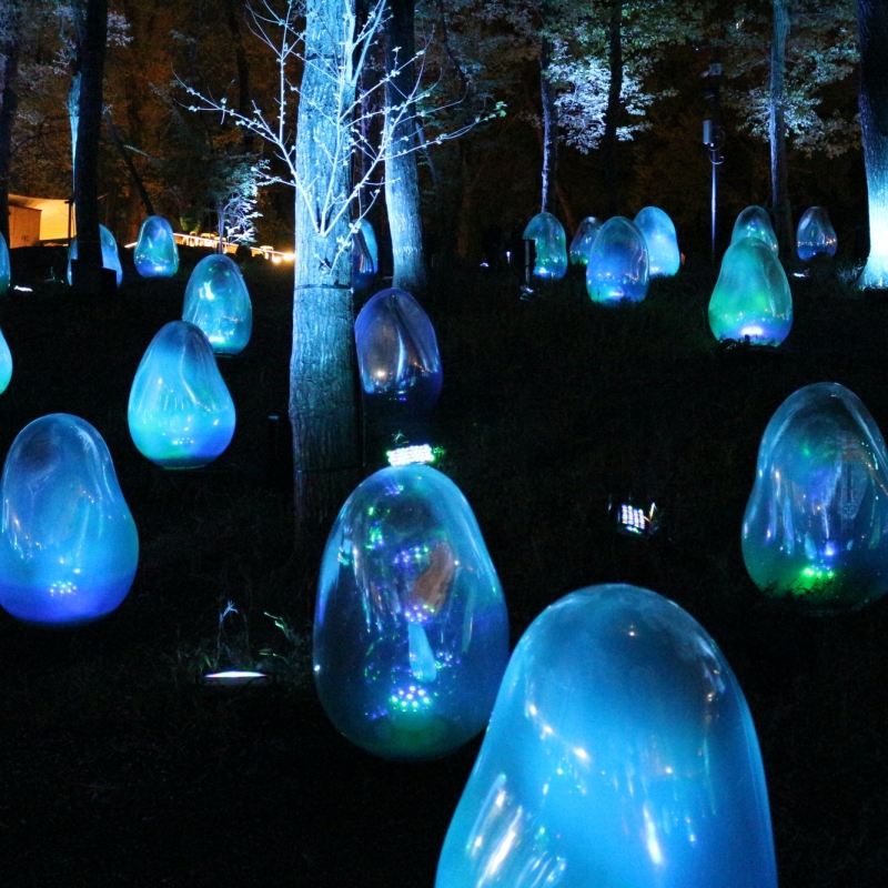 東所沢公園内の武蔵野樹林パークで常設展示されている「チームラボ どんぐりの森の呼応する生命」。昼と夜で異なった世界観が楽しめます。
