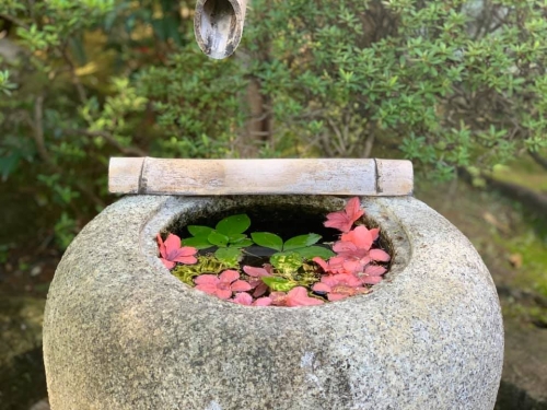 美しい日本庭園が見事なお寺で、花手水は本堂のすぐ横に置かれています。