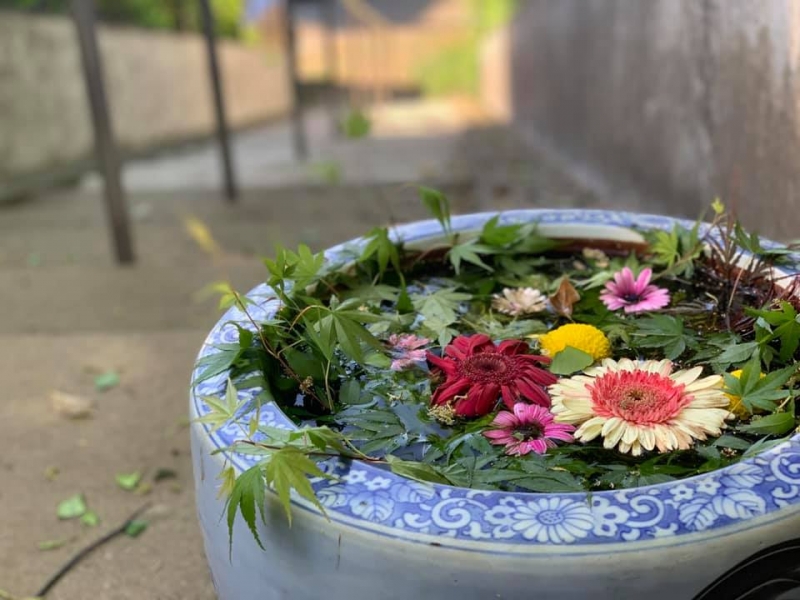 手水舎に美しく飾られた花々をみると、より心が安らぎますよね!