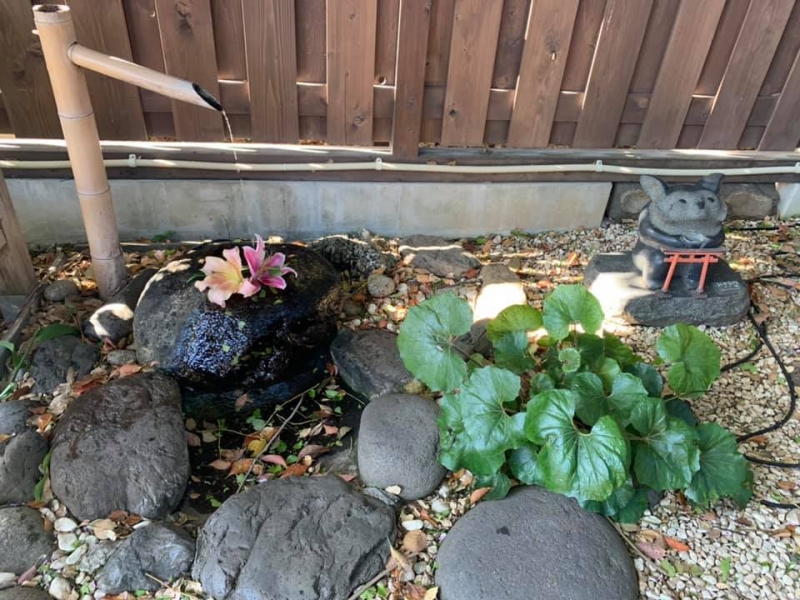 こちらは「稲荷の井戸」と呼ばれている湧水で、滴る水の音と、美しい花手水がとっても心地いいです。