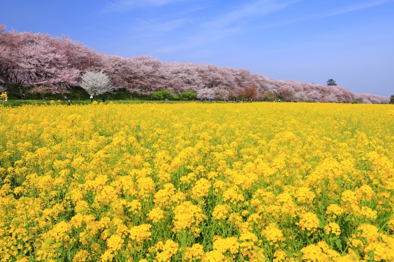 権現堂堤は桜の名所としてよく知られており、春には1kmにわたって約1,000本のソメイヨシノが綺麗なピンク色の花を咲かせます。と同時に隣には菜の花が元気に咲き、ピンク色の桜と黄色の菜の花のコラボレーションが見事です。