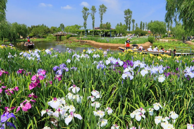あやめ祭り期間中は園内の水路を周遊するサッパ舟にも乗ることができます。 また園内の船乗り場からは名勝十二橋めぐりの船が就航しています。入園料は時期により異なり、あやめ祭り期間中で大人800円。