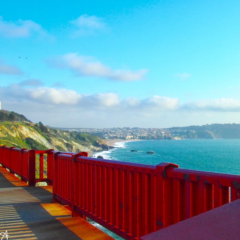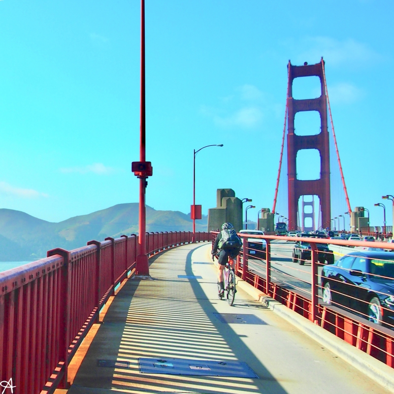 ゴールデンゲートブリッジの全長は、約2.6kmです。橋の赤・海の青がとにかく美しく、つい何度も立ち止まりたくなってしまいますが、橋を渡っている途中、スピードを出した自転車が多くいます。