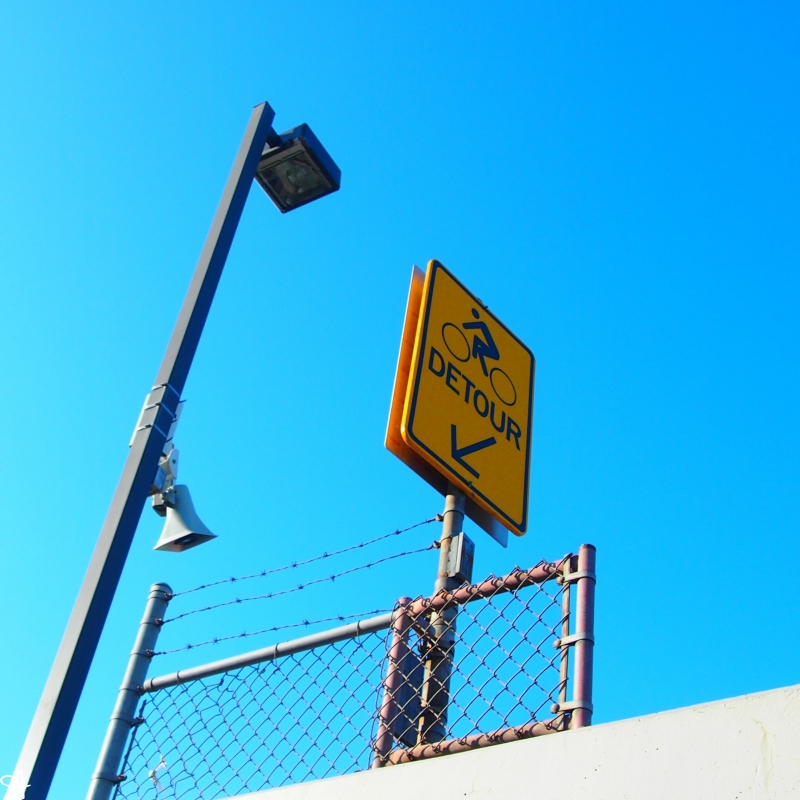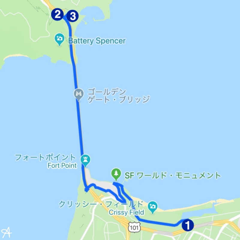 地図上の①地点がレンタサイクルをするスポーツ用品店「SportsBasement」、②地点が駐輪所、③地点がビュースポットです。片道約5km、景色を見たり途中立ち止まったりすると、だいたい1時間ぐらいの道のりかと思います。橋の上は風が強いことが多いので、暑い季節でも念のため防寒具を持って行った方が良いと思います。