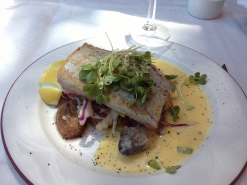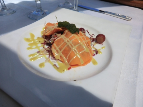 サーブされるカリフォルニアスタイルの料理は、トレイン内の厨房で作られるためどれも出来立て。どのお料理もソースが美味しく、ワインがすすみます。それぞれのお料理に合うワインがメニューに併記されており、グラスで注文することも可能です。