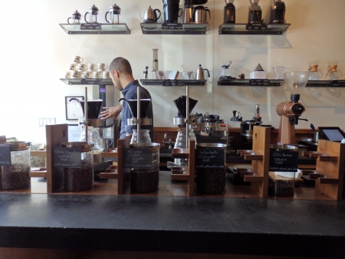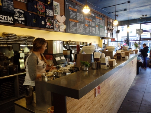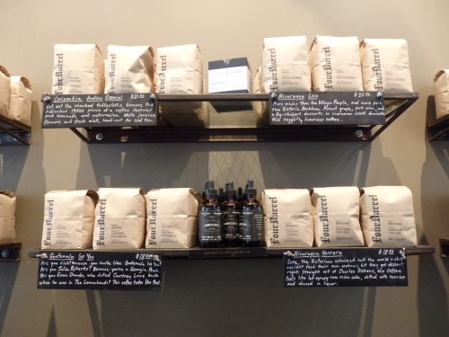 ミッション地区にあるフォーバレルコーヒー。日本でも栃木県に出店したことでも有名なこのお店は、グレーと木を基調としてシックな雰囲気です。