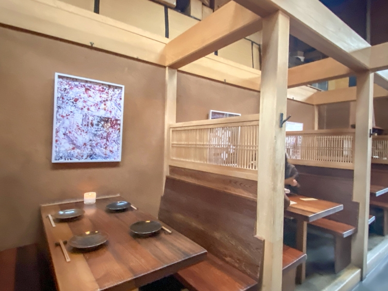 店内は日本の居酒屋を忠実に再現したような、和の雰囲気が最大の魅力。活気のあるオープンキッチンでは、料理が次々と作られていく様子を眺めることができますよ。