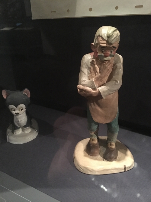 原画の展示の中に、木彫りのキャラクター人形などレアなコレクターアイテムがたくさん散らばっています。ミッキーマウスはとってもレトロなものも残っており、その表情はとっても豊か。色はくすんでいるのに、今にも動き出しそうなものばかりです。
