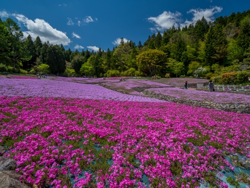 全国でも数少ない芝桜専門の庭園。例年4月中旬〜5月上旬にかけて、ゆるやかな丘一面を芝桜が埋め尽くします。地面が見えないぐらいに咲き誇ることから「花のじゅうたん」と名付けられました。ペットを連れての来園もOK、園内には食事ができる茶屋がありますが、お弁当の持ち込みもOKです。