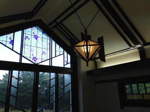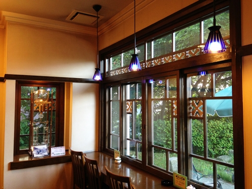 店内は、窓や扉など、あちこちに意匠が凝らされています。また、区切られた部屋によっても雰囲気が違うので、座った場所によってかなり印象が変わります。写真左の部屋は、応接室のような作りです。幾何学的な照明器具と繊細なステンドグラスがとても印象的です。