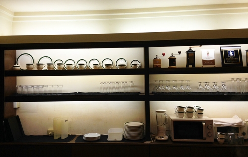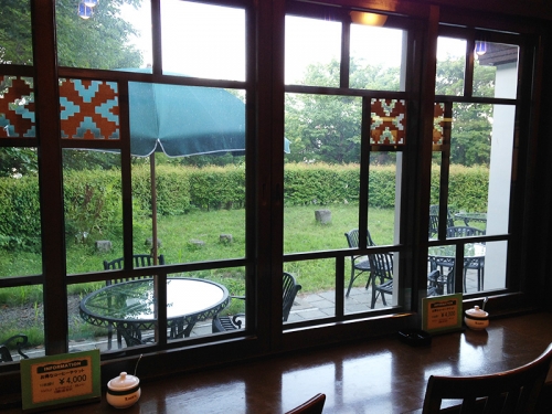 窓際のカウンターから見える中庭も素敵です。コーヒーカップやワイングラスなども「芸術」として綺麗に一角にディスプレイされています。