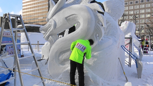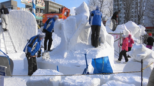 雪像に使用する雪は真っ白であることが求められるので、近隣の山などから自衛隊のトラックに大量の雪を積んで来て使用します。